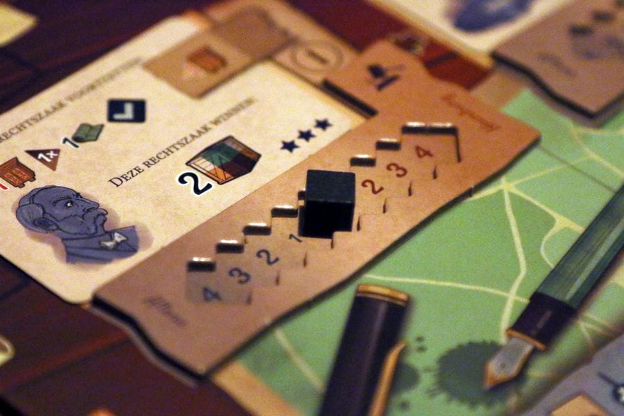 Les Procès : c’est la partie la moins pratique du jeu de par ses trois pistes mobiles que l’on déplace en fin de manche suivant les résultats. Pour gagner un procès, il faut donner des ressources et ainsi faire progresser le marqueur (un cube) de son côté. On peut aussi jouer sur les deux autres procès qui attendent et anticiper. À la fin de la manche, le premier procès part à la poubelle (le cube est sur 0/1) ou, si les conditions sont remplies (le cube est sur la case 2/3), dans la réserve du gagnant. Les procès suivants glissent, le second devenant ainsi le procès en cours. Trois procès récupérés et c’est la victoire immédiate.