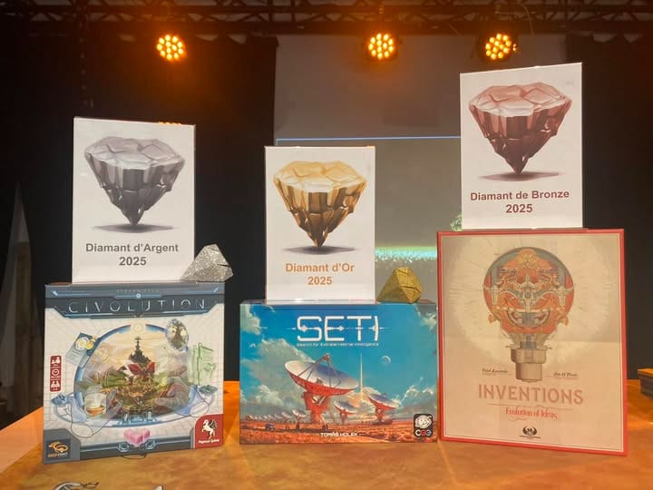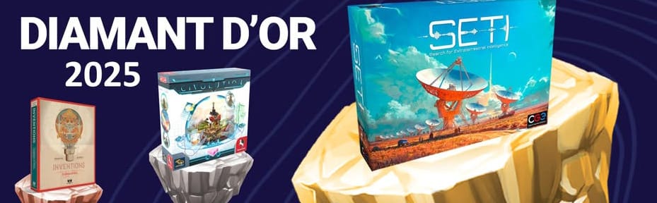 Diamant d’or 2025 pour Seti de Tomas Holek chez CGE (localisé par Iello) un jeu dont l’équipe du Diamant d’or écrivait il y a peu sur leur site : “Seti propose un mélange de mécaniques pour coller le plus possible à son thème. Vous allez envoyer des sondes au travers du système solaire et vous poser sur les différentes planètes ainsi que leurs lunes, scanner les étoiles et leurs systèmes à l’aide de radiotélescopes et analyser ces données. Pour cela, vous disposez de crédits, d’énergie et de cartes toutes uniques vous proposant des actions de base bonifiées. Une partie de Seti dure 5 manches, à votre tour, vous pouvez faire une action principale et autant d’actions gratuites que vous le souhaitez. Un jeu tendu, des ressources limitées, mais sky is the limit ! à vous de faire en sorte que le monde découvre des intelligences extra-terrestres dont vous pourrez tirer le meilleur parti. Un jeu qui se démarque immédiatement par sa présence sur la table, donne envie de le jouer et fonctionne. Le tout est au service d’un thème présent et fort qui parle à tout le monde. Un jeu qui demande plusieurs parties pour l’appréhender, le maîtriser sera un autre défi.”