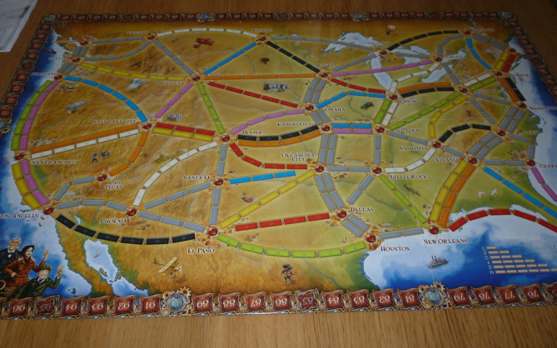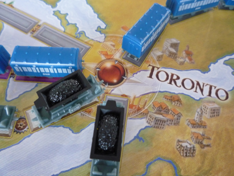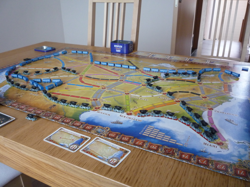 Bon le jeu étant sur-dimensionné, va falloir bouger de votre place pour placer vos wagons, ou avoir de l'aide des autres joueurs. Ça donne un peu l'impression d'une version géante. Maintenant, ça n'apporte pas quelque chose d'essentiel à la partie, c'est juste agréable de manipuler de beaux petits trains ! 🙂