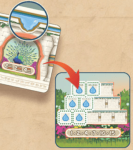 Commençons par l’irrigation, en début de partie vous avez reçu une carte du même nom qui vous indique un schéma d’irrigation à réaliser et plus vous respectez cette contrainte plus vous gagnerez de points de victoire en fin de partie (1 à 15).