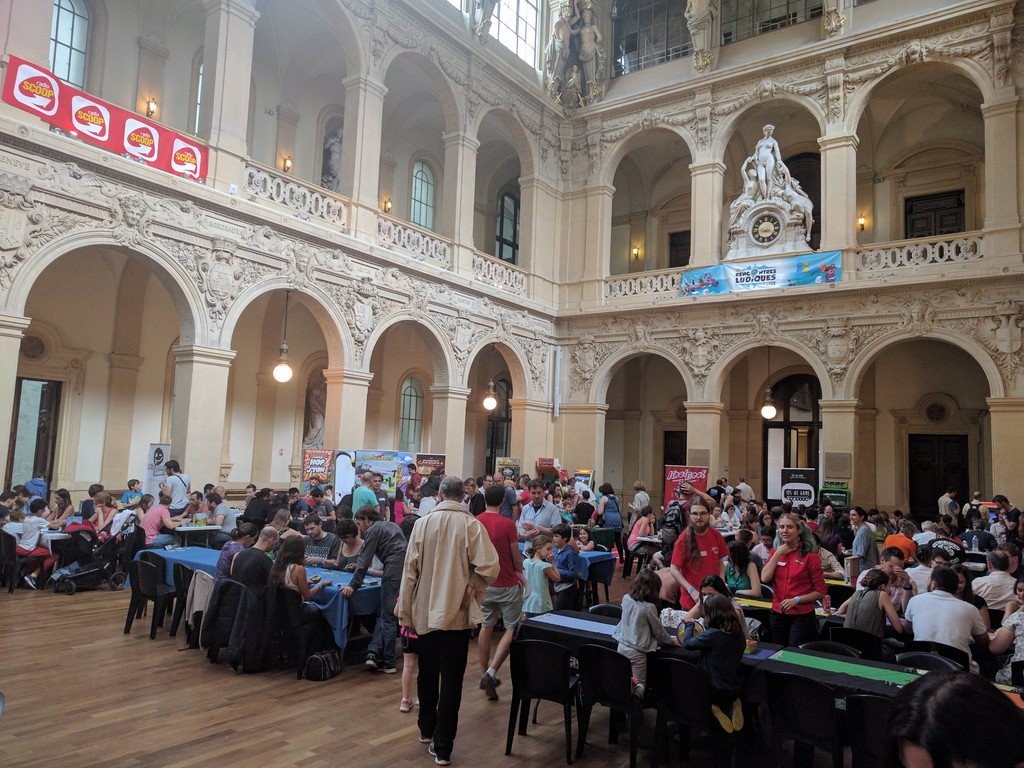 Portées par Florent Mortier et Didier Lenain (ELLUD), les rencontres ludiques de Lyon grandissent d’année en année. Pour leur 3eme édition, ce n’est pas moins que le prestigieux palais de la bourse de Lyon qui se trouve investi par une avalanche de cartes, de pions, de figurines, de joueurs, d’enfants, etc… sous les yeux des illustres lyonnais dont les portraits et noms sont exposés dans les différentes salles du palais.