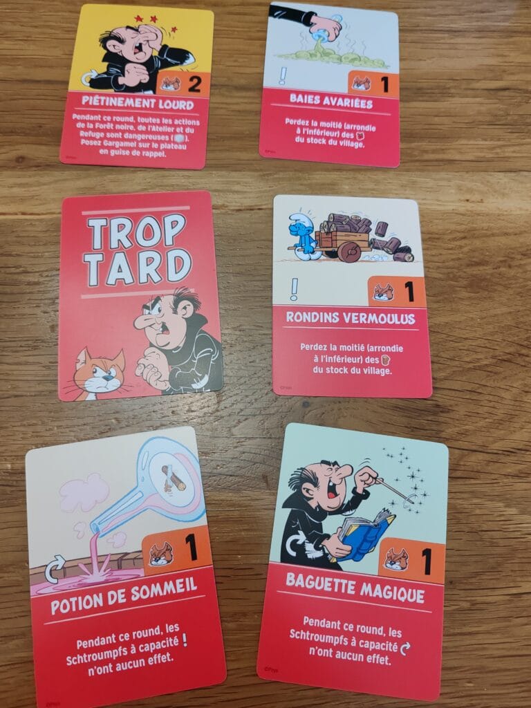 Étape 3 : lorsqu’il ne reste plus aucun meeple Schtroumpf à jouer, il est temps de dévoiler une carte Gargamel, chacune dotée d’un effet négatif (perte de ressources, défausse de cartes, actions empêchées…) et du déplacement d’Azrael, qui surveille un lieu et vous oblige à lancer son dé, sur le modèle du dé Danger.