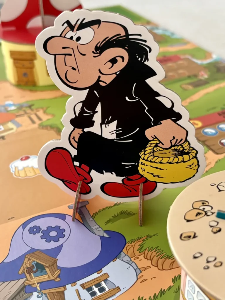 De ce côté, Maestro Media a fait un travail remarquable. Le matériel est splendide : maisons en 3D, meeples et pions de ressources sculptés et gravés, silhouettes de Gargamel, d’Azrael ou du Cracoucass, qui apportent une verticalité et une perspective incroyables au plateau. Les cartes sont drôles, saturées de couleurs magnifiques, et mettent dans les meilleures dispositions ceux qui viennent pour l’univers, pour jouer en famille, ou même pour persévérer…