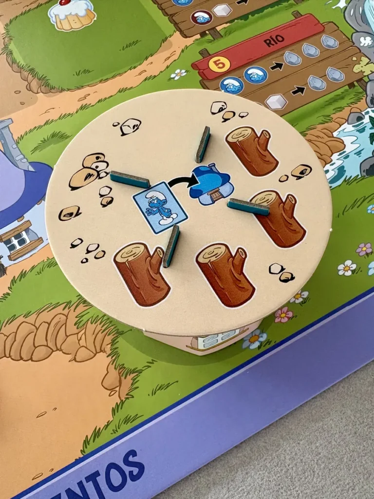Jeu coopératif dans lequel la tension repose sur un placement d’ouvriers et une gestion des ressources classique et sans surprise, mais au rythme sophistiqué, travaillé par les cartes et les dés. Puisque vouloir réaliser une action puissante nécessite d’y poser un deuxième meeple et donc de reporter l’action. Au risque de ne plus avoir de meeple en réserve, emportés par le Cracoucass, ou que le jet d’un dé Danger vous prive de certaines ressources pour effectuer les actions. Les dés Danger ou Azrael possèdent des bonus sur certaines ressources, mais surtout des malus très punitifs : l’attaque du Cracoucass, qui vous enlève un meeple ; la Pénurie, qui vous retire une ressource ; ou la défausse de vos inventions fabriquées ou de vos cartes Schtroumpfs.