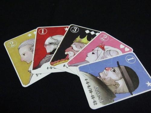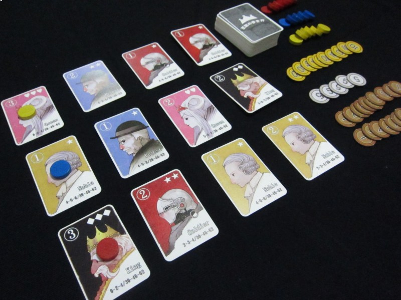 Ces cartes Personnages ont des couleurs différentes : le roi est noir, la reine est rose, le noble est jaune, etc, et ces couleurs correspondent aussi aux disques de missions (autrement dit, le disque noir à pour Personnage clé le roi, le disque rose à pour Personnage clé la reine, etc). C'est bien, vous suivez.