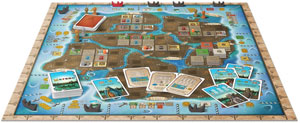 Certaines actions permettent de placer des magasins sur les îles – ils existent en différents types. Bien sûr, il y a des verreries. Mais ouiiii, vous pourrez faire de beaux objets en verre que vous vendrez aux touristes parce que vous savez qu’ils en sont friands. Alors, attention à bien vous placer, pour attirer le plus possible d’acheteurs. Pourquoi faites-vous tout cela ? Pour marquer des points de victoire avec vos cartes et via des actions du plateau, et oui, nos sacro-saints PV !