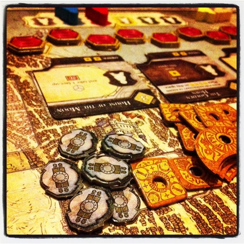 la gestion d’une nouvelle ressource : les crânes bleus de corruption, qui sont associés à des actions puissantes mais synonymes de pertes de PV en fin de partie selon une piste de corruption (certaines quêtes ou carte intrigue permettent de s’en débarrasser ou d’augmenter leur valeur négative de PV)