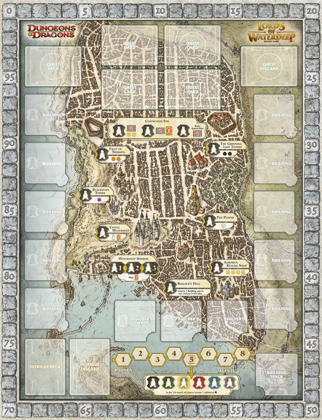 Le but est donc de prendre le contrôle de la mignonnette ville d’Eauprofonde, ville bien connue des rôlistes ayant pratiqué les univers officiels d’AD&D. Chaque joueur incarne un des seigneurs de la ville, à la tête d’une des cinq grandes factions. Pour l’instant, ça semble bateau, mais que l’on se rassure : il y a un twist. Chaque faction gagnera de l’influence en réalisant des quêtes, et qui dit quête dit… aventuriers. Eh oui, le but est donc de garder un max d’aventuriers à la taverne le temps de leur trouver une occupation !