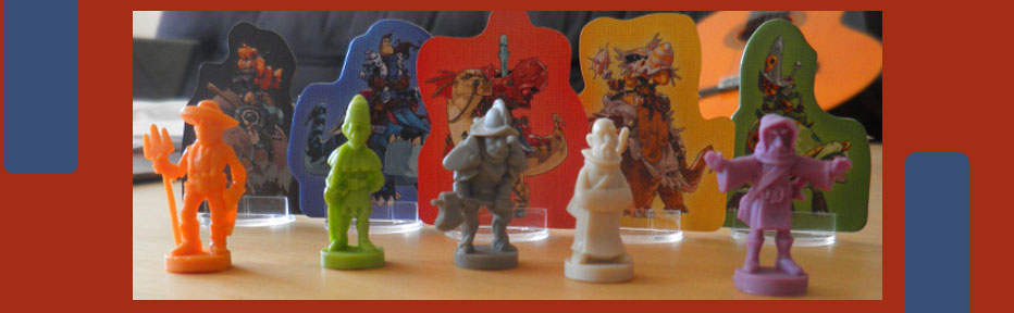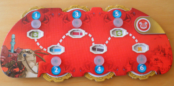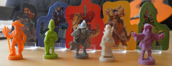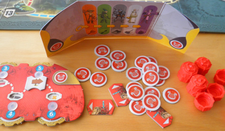 Derrière le paravent de Haricot Rouge en début de partie : les bardes, trois jetons pour le score à la fin, des tours des mages. On stockera l’or et les unités derrière.