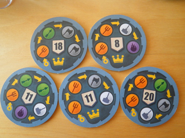 En fin d’année, au décompte, on élimine les prétendants les plus faibles sur certains aspects. Il n’y aura qu’un Lord. (Moi, Haricot Rouge, bien entendu, mais avais-je besoin de le préciser ?) On tire les ordres d’élimination en début d’année. Par exemple, si on l’a tiré renommée > sous > magie : on élimine le prétendant ayant la plus faible renommée, puis, parmi les 3 restants, celui qui a la plus petite trésorerie, et on regarde enfin dans le duo gagnant qui a le plus de tours des mages.
