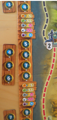 La face « recrutement » des tuiles à poser sur les villes. La couronne indique le set à trois joueurs. Trois picots, trois joueurs. Et on recrute dans le sens des flèches. Ergonomie, ô puissante magie.