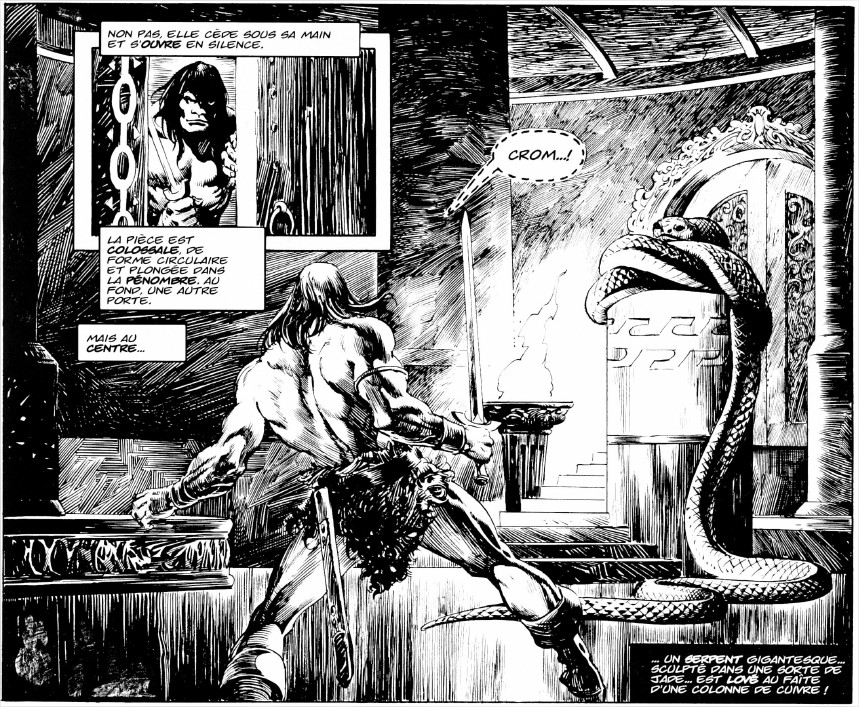 – L’ambiance est, pour moi, une vraie réussite. Sans fioriture et sans concession à l’univers de Howard, on s’y croit ! L’univers Conan est servi par un scénario d’escarmouche, ici dans un camp picte pour sauver une fille, un classique. On sent que les héros sont capables de défaire des hordes d’ennemis. Les cases sont larges et peuvent contenir autant d’ennemis que leur taille… Quel tumulte.
