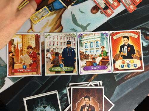Le premier tour, chacun choisit son quartier, sans se gêner. D’ailleurs, il va falloir attendre les derniers tours pour qu’ils commencent à vraiment se tirer dans les pattes. Dap se réserve un terrain en L et Sha installe une barre de 3 cases qui touche à la fois Wall street et Pine, ce qui lui donne 3 PV et son marqueur dépasse vite le 6 sur la piste. Il a désormais accès aux bâtiments en argent. Umberling, lui, est un peu derrière, mais prépare de gros coups.