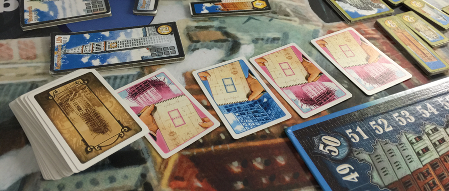 Une des problématiques principales des joueurs va être d’une part la gestion de la destruction / reconstruction de bâtiments déjà placés mais surtout la capacité à planifier l’acquisition de terrains mitoyens sans trop révéler ses intentions aux autres joueurs pour éviter le blocage. Les cartes de terrains faisant 2 ou 3 cases, il faudra plusieurs cartes à des tours successifs en faisant de la réservation par ouvriers (ils sont en nombre très limité) pour arriver à obtenir un espace suffisant à la construction de nos plus gros bâtiments et du légendaire.