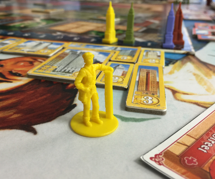 À côté du plateau, vous avez pour chaque joueur tout un ensemble de tuiles qui symbolisent les buildings. Il y a des barres qui recouvrent 2 cases, d’autres en forment de L… Ça rappelle un peu les formes des briques d’un bon vieux Tetris, vous savez. Notez bien, pour la petite histoire, que tous les bâtiments du jeu sont inspirés par des vrais buildings du début de siècle du quartier des affaires.