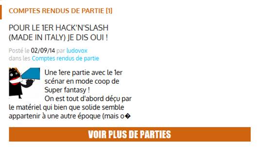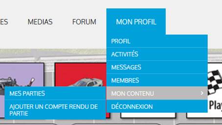 Nous avons aussi du nouveau sur le site. En effet, vous pouvez désormais entrer vos avis et vos comptes rendus de parties. C’est nouveau, c’est tout beau, et nous espérons qu’il n’y aura pas trop de petites pétouilles. En tout cas, depuis votre « profil » vous avez acès à un onglet « mon contenu. De là, vous pourrez voir toutes vos parties entrées, et en ajouter d’autres.