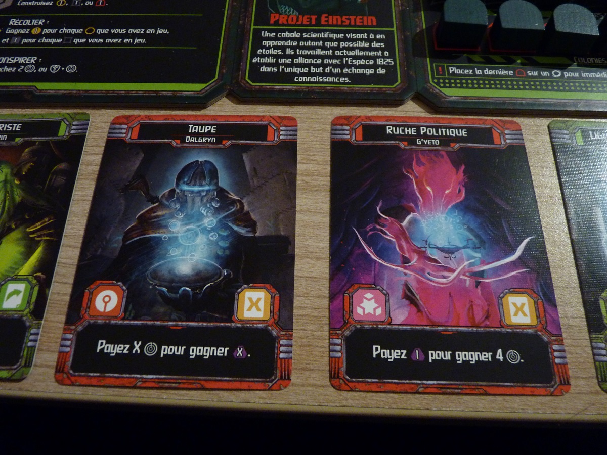 Energies et métaux seront indispensables à l’établissement de vos structures. Ne faites pas vos radins et n’hésitez pas à vous développer, les ressources étant limitées à 10 de chaque en fin de tour (je vous voyais bien faire votre fourmi !). Faites cependant attention, car la place est limitée sur chaque monde, et le premier arrivé sera le premier servi !
