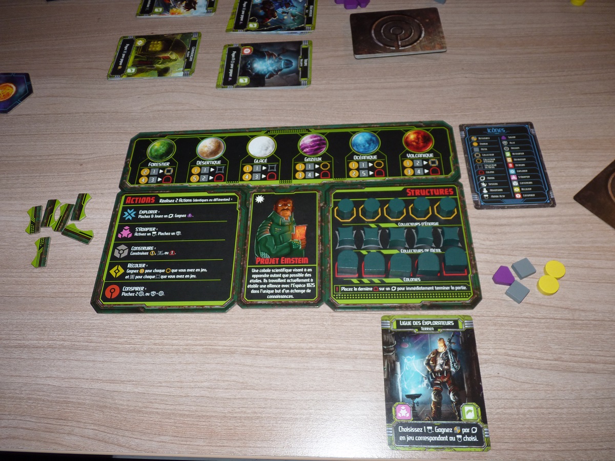 Pour assurer le suivi de l’évolution de vos concitoyens, vous disposerez d’un plateau de joueur sur lequel apparaît de nombreux éléments. Heureusement, tout a été pensé pour simplifier vos premières parties (ainsi que celles à venir), et l’ensemble bénéficie d’une iconographie claire et appuyée par une aide de jeu individuelle très pratique. Ainsi, on retrouvera une description succincte de votre race galactique, l’ensemble des actions que vous pourrez réaliser, un suivi des structures (collecteurs et colonies) que vous aurez installées, le type de planète sur lesquelles vous pourrez vous développer (nécessitant une adaptation au préalable), et les coûts de construction des structures. Ce sera véritablement votre tableau de bord pour l’ensemble de la partie.