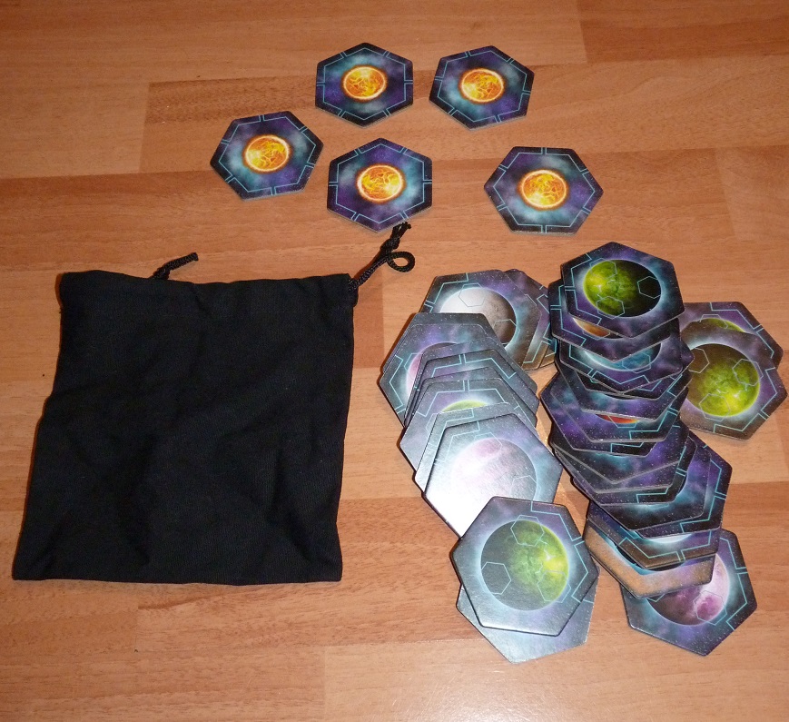 On trouve également des tuiles hexagonales à l’effigie des planètes et des étoiles qui se placeront au centre des systèmes (fonction du nombre de joueurs). Ces planètes seront tirées aléatoirement d’un sac aux dimensions plutôt ridicules… Comment pourrait-on mélanger les tuiles correctement dans un tel gant de toilette ? Il s’agit heureusement d’un petit couac largement pardonnable au vu de la qualité du reste du matériel.