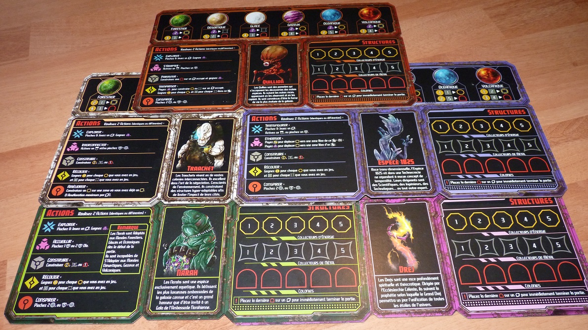 Question rejouabilité, les plateaux proposent un renouvellement intéressant avec un départ asymétrique ou des peuples aux capacités identiques. Après une partie à 3 joueurs avec le verso des plateaux, ceux-ci orientent clairement le joueur dans une voie plutôt qu’une autre. J’ai pris un plaisir coupable à accélérer la fin de partie avec les Drej qui permettent de facilement installer des colonies directement sur les étoiles : autant dire que j’ai orienté une grande partie de ma tactique sur l’obtention rapide de ressources, et sur le gain des majorités dans les différents systèmes.