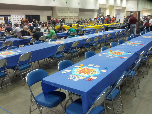Ce matin, le bus qui nous amène au Convention Center est blindé et certaines personnes voyagent debout. Nous arrivons un peu avant l’ouverture et en profitons pour faire un tour dans les halls dédiés aux joueurs, ce sont des espaces ouverts pour qu’ils puissent jouer aux jeux qui leur plaisent. Contrairement à Essen, la hall des exposant est plutôt petit (cela correspondant à 1 seul hall de Essen) mais il y a beaucoup d’autres halls, autour destinés aux tournois, aux conférences etc…