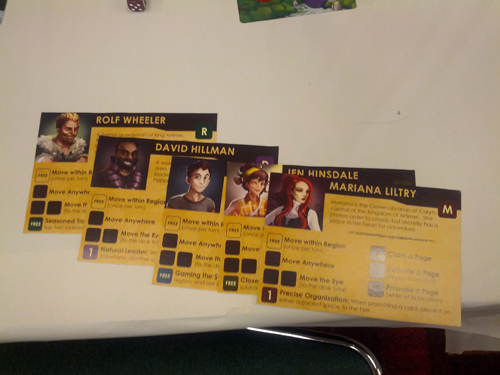L’après-midi nous testons Tragedy Looper. C’est un jeu à scénario (la boite en contiendra 10 au total) qui se joue à 4 joueurs dont l’un incarnera le méchant. Il est joué ici par quelqu’un de chez Zman qui va essayer de réaliser son plan machiavélique -prévu par le scénario donc.