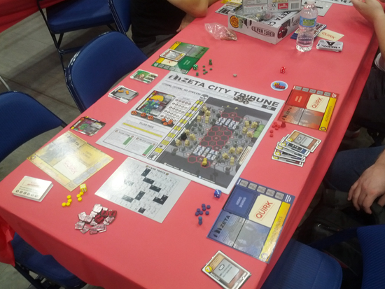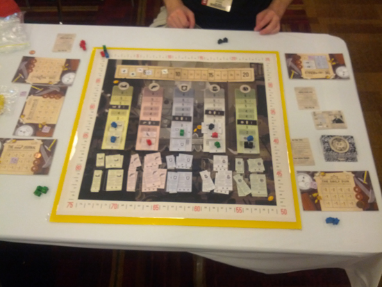 Nous mettons du temps à trouver les jeux Asmadi. Comme certains éditeurs, ils ont un tout petit stand dans la hall des éditeurs et une salle réservée pour eux avec pleins de tables pour faire jouer les gens. Ils nous présentent rapidement les règles de Consequential (Carl Chudyk et Chris Cieslik) et de Penny Press (Robert Dijkman Dulkes et Matt Golec. Ces deux vidéos seront publiées sur le site dans les jours à venir.