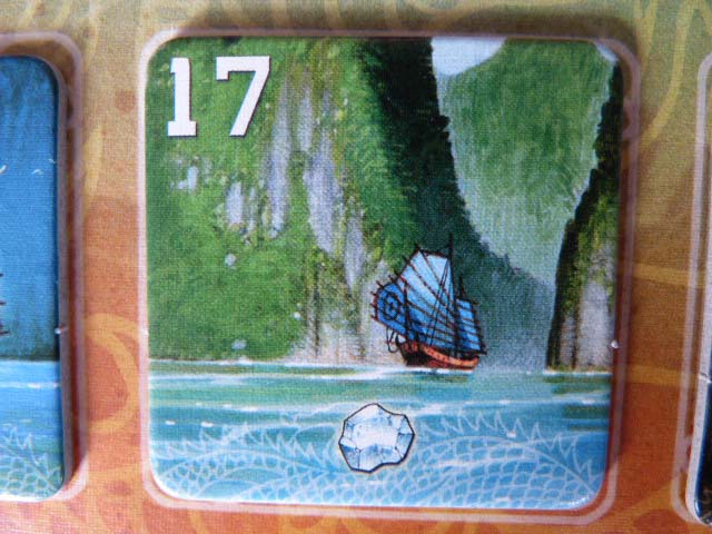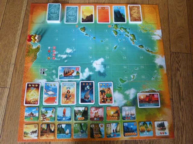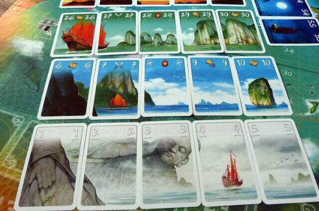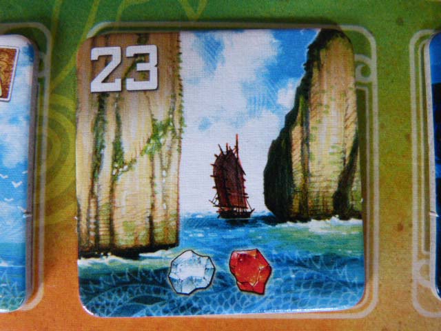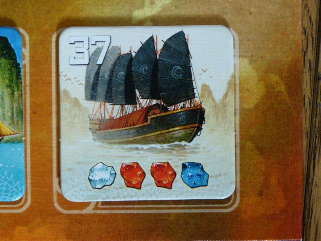 - si vous ajoutez une carte d’une couleur déjà présente dans votre expédition, votre petite jonque en bois fournie bien heureusement dans la boite va avancer sur le plateau principal d’une case tout droit vers la droite.