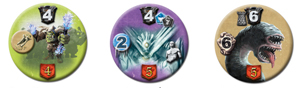 · le monstre qu’on va devoir se cogner : la première fois qu’on attaque un site, on retourne un jeton de monstre. La couleur du jeton indique le type de monstre qu’on risque de rencontrer et permet de se faire une idée des chances qu’on a de le battre, mais ne donne pas les détails, c’est la surprise