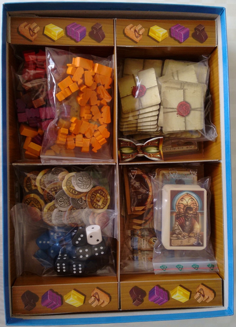 L’insert renforcé qui divise la boite en quatre parties égales, typique de l’éditeur, est comme toujours des plus solides. Il reprend des illustrations du jeu, et même si ce détail est très accessoire, ça fait toujours plaisir. Les sachets zips fournis en quantité suffisante vous permettront de trier et de caler le tout idéalement, ce qui évitera les gros chamboulements en cours de transport.