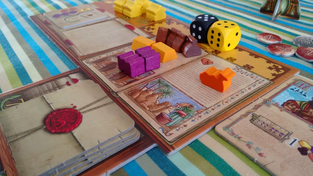 La prise d’action via les dés fonctionne bien. Les auteurs ont su amalgamer adroitement des choses déjà plus ou moins vues : la relance de dés pour 1 chameau sent le Troyes à plein nez, les actions Faveur du Khan et Obtenir des contrats ont des faux airs de Bora Bora. De manière plus diffuse, on pense également à Kingsburg. Des ressemblances qui ne me posent aucun souci, tant la mayonnaise prend bien.