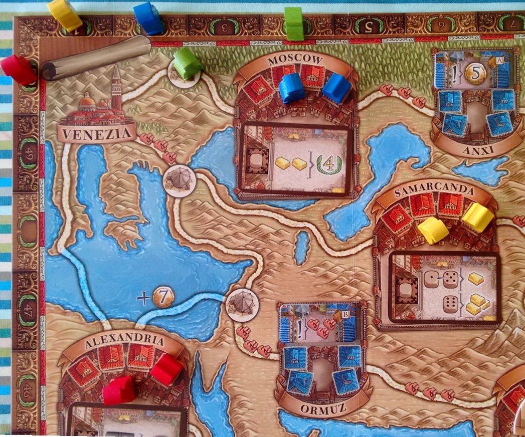 Le ton est donné : sur sa première action, Raschid ad-Din Sinan met cap au Sud, et se rend sans plus tarder à Alexandria, s’emparant ainsi du bonus unique accordé en exclusivité au premier à s’arrêter dans cette ville (5 pièces). Second à s’élancer, Berke Khan réplique en fonçant plein Est s’établir à Moscow et empocher 2 ors. En plus de cela, leur comptoir dans ces « grandes » villes (à encart rouge sur la carte) leur permettra d’accéder ultérieurement à l’action locale. Attention, cette action ne peut être utilisée qu’une unique fois par manche, tous joueurs confondus.