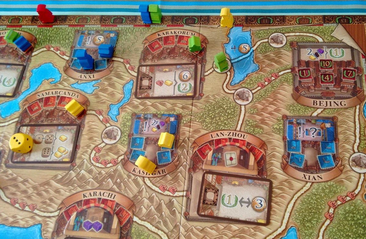Les manches suivantes confirment la tendance : une fois « engagé » sur une route, il semble un petit peu farfelu de faire demi-tour, étant donné qu’il n’y a aucun avantage à repasser par Venezia, et qu’au contraire, rallier Bejing est récompensé. En effet, la carte se compose schématiquement de quatre « voies » d’Ouest en Est, sans chemin de traverse qui permette de bifurquer. Ainsi, Matteo Polo et Berke Khan se tirent la bourre sur la route du nord. La prime au premier arrivé à Karakorum ira finalement à Matteo Polo. Du coup, Berke Khan fait carrément l’impasse sur la ville et voyage de 4 étapes d’une traite afin de s’installer à Bejing en premier (10PV).