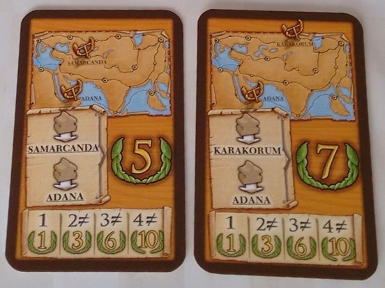 Ce comptage assez alambiqué au premier abord a une raison d’être : compenser l’avantage d’un joueur obtenant deux objectifs avec une ville commune. Ainsi, avec les deux objectifs ci-contre, un comptoir à Adana compte pour les deux objectifs, ce qui est plutôt bonnard. Revers de la médaille : tous objectifs confondus, le maximum est de « seulement » 6PV additionnels pour 3 villes distinctes en tout.