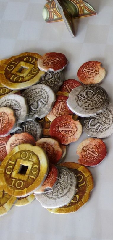 Outre cet aspect spatial, la concurrence joue à plein sur les zones d’action. Prendre une action n’en prive pas les autres, mais toute action déjà prise par un autre devient payante. De fait, nous sommes tous plus ou moins sur la corde raide au niveau des pièces, à l’exception de Berke Khan dont le pouvoir l’exempte de cette taxe : il ne paye jamais aucune action. Sa richesse grimpe d’autant plus vite qu’il a établi un revenu récurrent de 5 pièces sur la petite ville d’Anxi (voir ci-dessous). Il utilisera donc cette manne pour « acheter » des longs déplacements, et essayer de remplir ainsi ses objectifs.