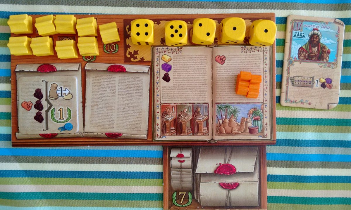 La prise d’action via les dés fonctionne bien. Les auteurs ont su amalgamer adroitement des choses déjà plus ou moins vues : la relance de dés pour 1 chameau sent le Troyes à plein nez, les actions Faveur du Khan et Obtenir des contrats ont des faux airs de Bora Bora. De manière plus diffuse, on pense également à Kingsburg. Des ressemblances qui ne me posent aucun souci, tant la mayonnaise prend bien.