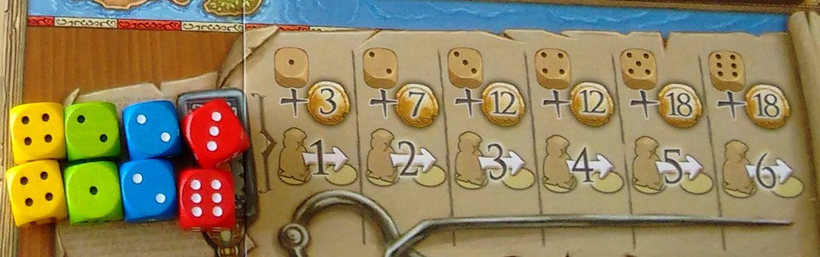 - comme pour la plupart des zones d’actions, si un autre joueur l’a déjà utilisée à cette manche, il faut en outre payer son action, c’est à dire verser un montant en pièces correspondant au plus petit dé utilisé