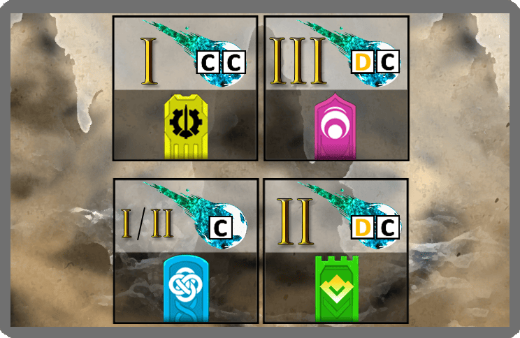 Dans la boîte de base, 8 mythologies vous attendent et seulement 4 sont jouées à chaque partie. Voici les dos de cartes des 8 premières.