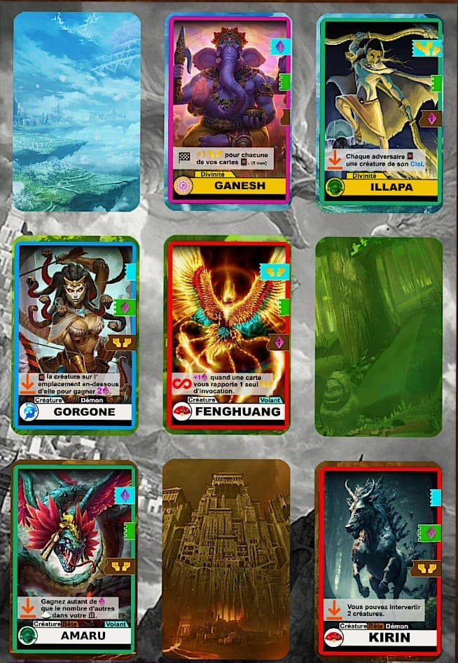 Max : À partir du thème, puis du choix des mythologies, j’ai cherché les divinités et créatures les plus représentatives de chacune. Et à partir de ce que chacune de ces entités représentait dans leurs cultures respectives, j’ai défini une valeur de base pour chacun des trois niveaux de notre panthéon dans lequel on peut les invoquer. Par exemple, qu’Hadès rapporterait deux points de victoire quand on l’invoque dans les abysses, et rien du tout en l’invoquant dans le ciel. Toute la conception de l’équilibre du jeu a donc d’abord commencé par un gros travail de documentation. Il fallait aussi veiller à un certain équilibre dans chaque mythologie. Si, par exemple, il y a beaucoup de créatures ayant un rapport avec la mort dans la mythologie Celte, il fallait quand même en chercher quelques-unes ayant un lien avec le ciel et le monde des vivants. Mais sans chercher un équilibre parfait dans chaque mythologie non plus, on préfère avoir des différences marquées entre chacune. Sinon à quoi bon proposer autant de mythologies différentes ?
