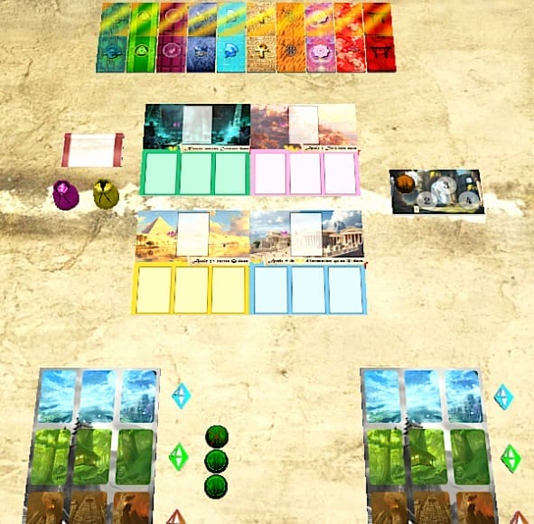 Mythologies, phase finale « Finalement on a convenu qu’avoir les 4 quarts de plateau dans le même sens était plus pratique, aussi bien pour les manipulations que pour la lisibilité. Cela nous a permis d’affiner quelques règles assez tardivement, sur la complétion des objectifs communs et les pioches de cartes. »