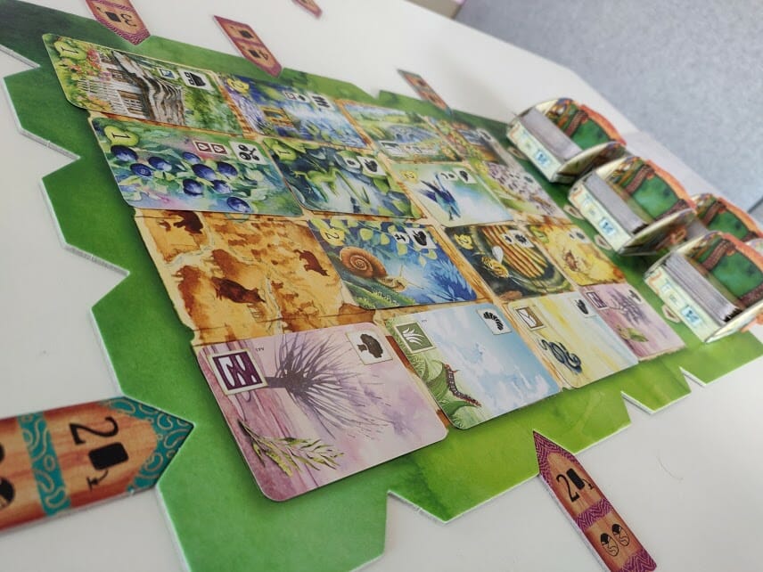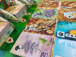 Le jeu est attirant visuellement. La première impression sur l’illustration de la boîte fait penser à une peinture d’encadrement des années 50, mais il ne faut pas s’y arrêter. Chaque carte est une aquarelle unique, et permet une immersion en pleine nature. Le pendant de ces belles gravures est que cela donne un plateau central un peu chargé, avec une perte en lisibilité générale, mais on finit par s’y faire. Après tout, il faut être attentif pour trouver les trésors de la nature. J’aurais aussi apprécié que chaque carte ait un libellé de ce qu’elle représente. Des sabots 3D en carton viennent compléter ce tableau général. Au moment de s’asseoir, on ne sait pas si le jeu est bien, mais il est agréable à regarder.