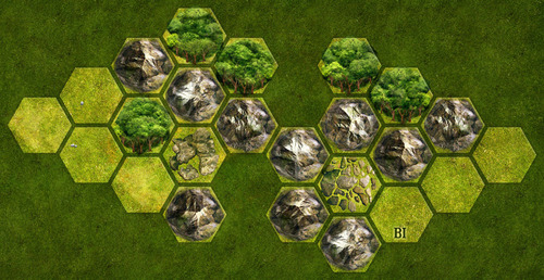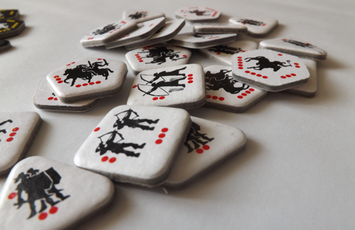 Le plateau de jeu se compose de modules recto-verso, ce qui lui permettra d’être joué à plusieurs reprises avec des terrains différents (montagnes, plaines, rochers, bois qui vont rendre les déplacements plus ou moins simples), et des tailles variables. Vous avez des jetons pour représenter vos unités : d’un côté elles sont « full » (‘je vais bien tout va bien‘) mais si vous les tournez de l’autre côté, cela signifie que vous avez connu des pertes dans vos rangs.