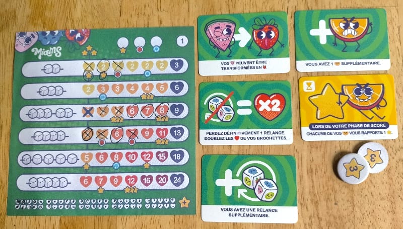 Avant de passer la main à sa voisine, on va pouvoir acheter une carte Miams, qui va typer un peu la suite de votre partie : des cartes permanentes qui vont apporter par exemple un fruit supplémentaire, ou permettre de transformer une fraise en kiwi, des cartes à effets de fin de tour, comme chaque kiwi de la brochette rapporte un cœur, ou des effet à usage unique, (récupérer une carte de la défausse). Ces cartes se payent en étoiles, mais la première de la colonne a un coût attractif de 0 étoile.