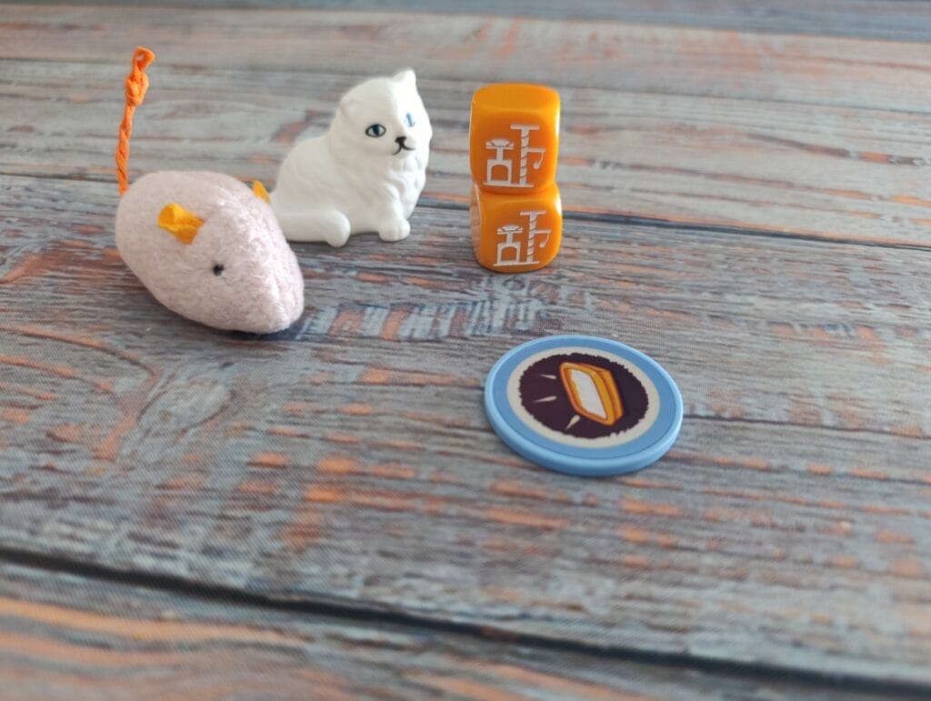 Le ludochrono m’avait intrigué. J’ai donc convaincu mon serviteur humain de se procurer une boîte. Si en recevant le colis j’étais déjà autant excité qu’au son de l’ouverture d’une conserve de pâtée, mes poils se sont hérissés de bonheur en voyant tous ses jouets sortir de la boîte : des gros dés oranges, des jetons type poker, un chat qui couine et surtout des souris en peluche. Ni une ni deux, je saute sur la table pour faire mumuse avec une des souris quand ce gros balourd d’Ihmotep me descend du meuble (pensez à vomir une boule de poils sur son bureau en représailles).