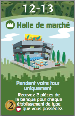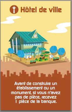Dans la mise en place, maintenant, vous avez l'option de faire une installation aléatoire au niveau des cartes Etablissement (on va en mettre 10 différents tirés au sort à partir de toutes les cartes de la boite de base + de l'extension touillées ensemble), histoire de se faire des ptits suspens, et de devoir s'adapter à ce qu'il y a sur la table, et puis, autre truc nouveau, chaque joueur prend ses établissements de départ, à savoir, le «Champs de blé», la « Boulangerie» avec l’«Hôtel de ville» en plus (voir à droite, là, juste là). Sympa l'hôtel de ville pour nous aider à construire !