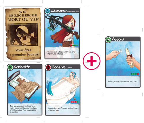 La mise en place est toujours la même. On démarre avec la carte Premier joueur + la Cachette + un Chasseur + un Monstre + une carte tirée au hasard (mais qui ne pourra pas être un monstre).