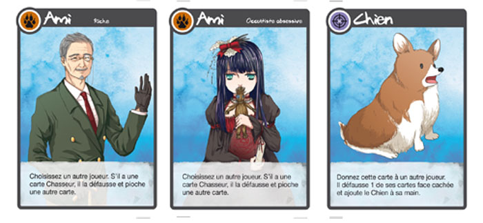 - Le chien est une carte unique mais drôle (enfin tout dépend qui on est). Ce sale clébard renifle tout ! On le donne, le joueur se défausse d’une carte. Il pourra ensuite le donner à son tour, etc… Un vrai buldozer à poils courts !