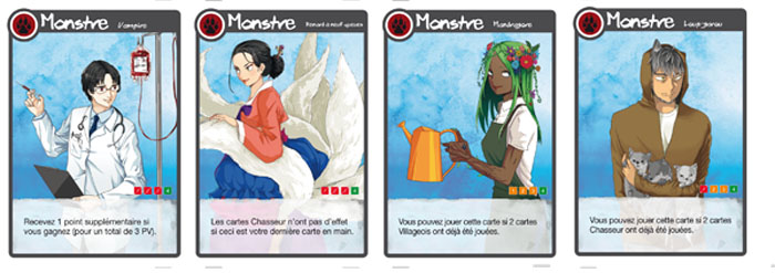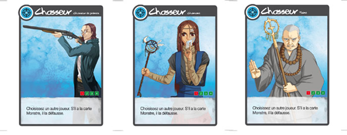 - Les chasseurs ont tous le même pouvoir « choisissez un joueur. s’il a la carte monstre, il doit la défausser » (Impossible à faire au 1er tour)