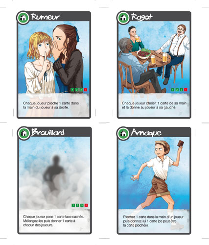 Certaines actions ne se font qu’à certains moments. Les carrés de couleur sont là pour vous le rappeler. Ici Brouillard, Rumeur et Ragot ne peuvent pas être joué à la dernière manche.