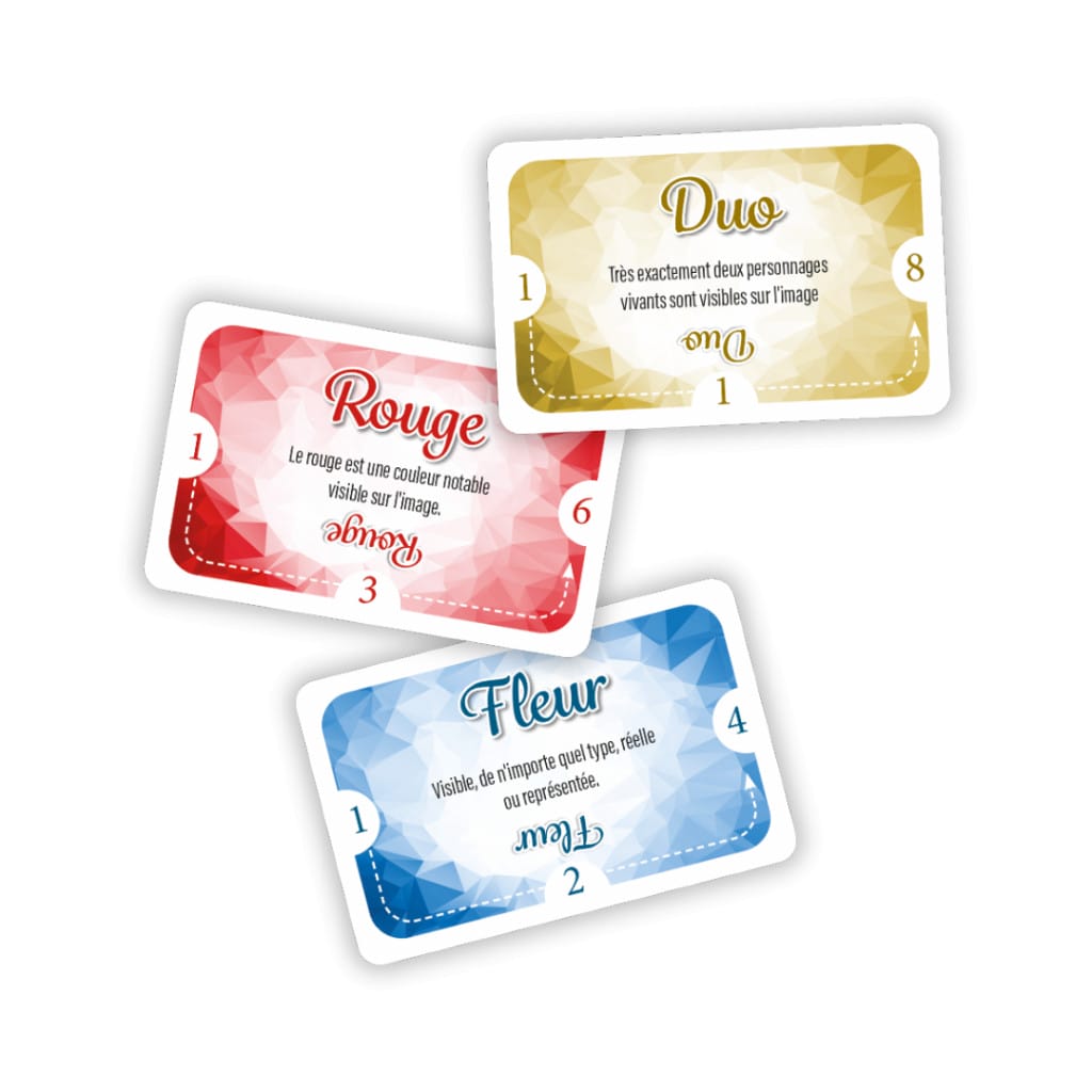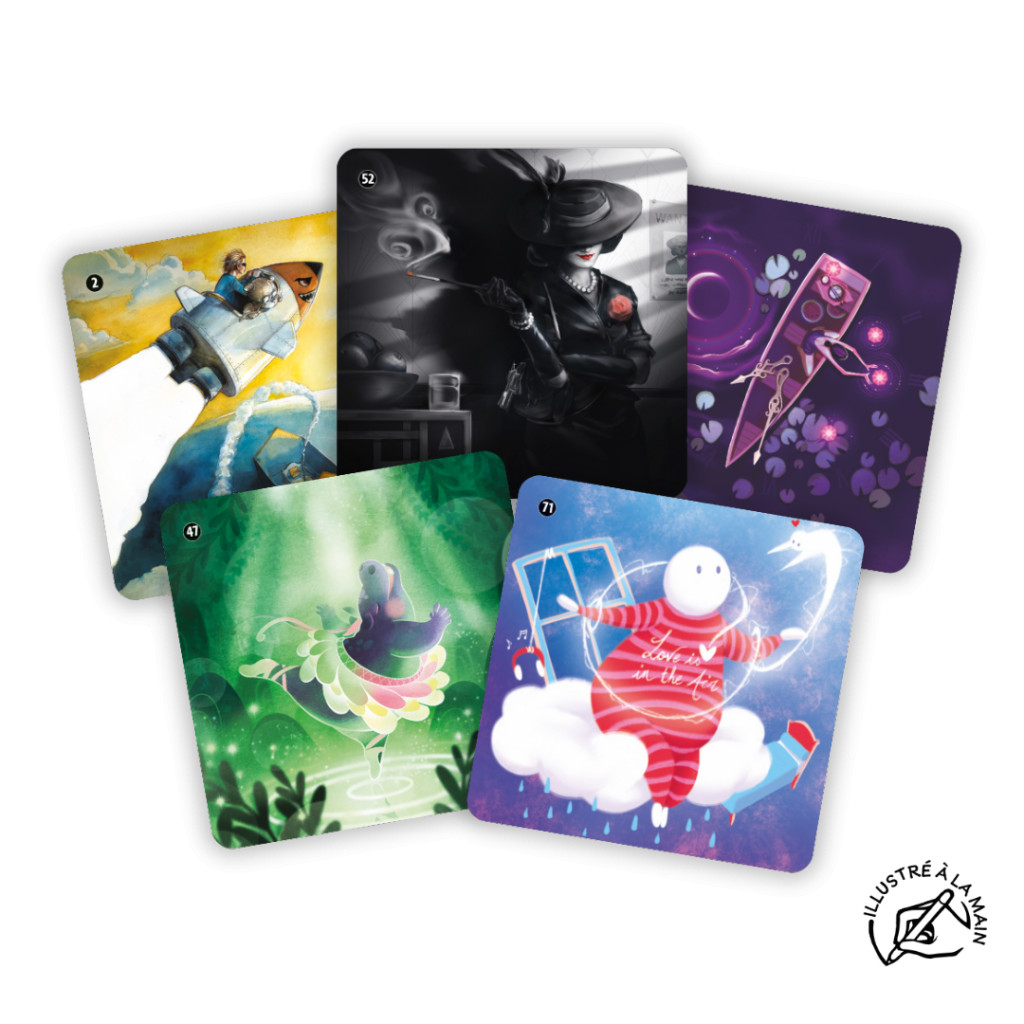 Ainsi manche après manche on va compléter notre grille d’images et de critères mots ou ambiance. Je vous ai promis de la stratégie, elle réside dans le choix de la carte image pour son initiative, dans la probabilité qu’elle corresponde à un critère des cartes du marché, ainsi que dans le placement des cartes dans sa grille. Les cartes pouvant rapporter un nombre de points variable (en fonction de la difficulté) par carte qui remplissent le critère mot ou ambiance dans une ligne ou une colonne, voir même les deux si on a joué finement.